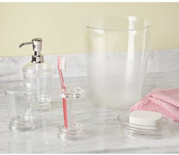 01259C5 Features: -Set includes12 oz. soap dispenser, toothbrush holder stand, tumbler, soap dish and trash can. -Made of durable plastic with rust-proof and plastic pump head. -Finish: Chrome and nickel. -Soap dish helps keep sinks and counter reside free. -Toothbrush holder stores 4 toothbrushes. -Franklin collection. Dimensions: -Soap Dispenser dimensions: 7.75" H X 3.5" W. -Toothbrush Holder dimensions: 5" H X 2.75" W. -Tumber dimensions: 4.25" H X 3.5" W. -Soap Dish dimensions: 7.75" W X 3.5" D.