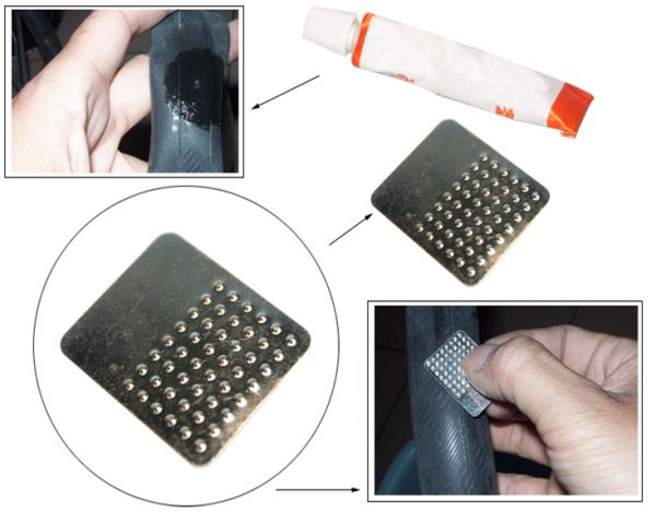 SIMPLE TO USE: Scuff punctured area with metal scuffer (provided) squeeze glue around punctured area and wait 5 minutes. Peel off sliver backing on patch and place over glued area. Press firmly to insure vulcanization. Remove clear top plastic from patch and it's ready for use.