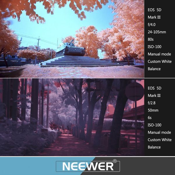 Neewer 58MM IR720 / IR760 / IR850 / IR950 Infrared Filters are designed to allow infrared radiation through but block all visible light up to 720nm / 760nm / 850nm / 950nm for photographing subjects and details that are not normally visible.