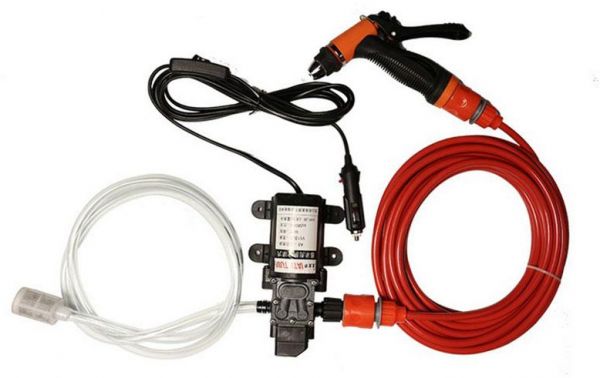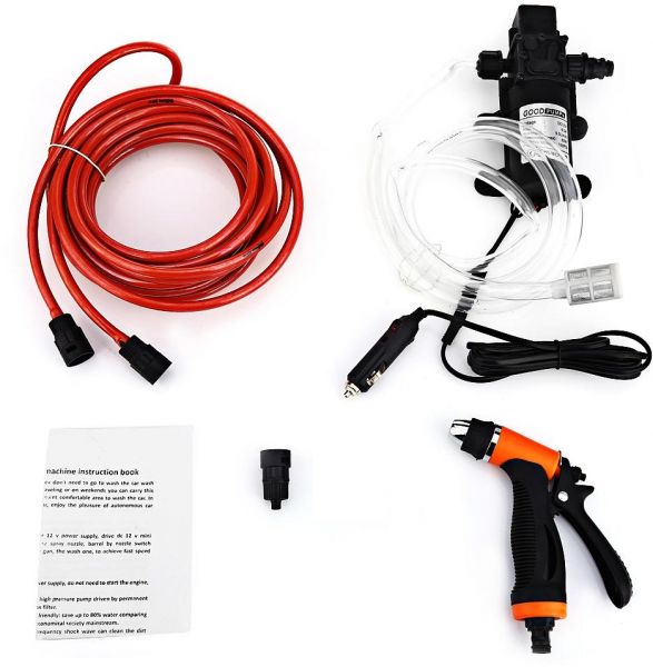 * Mini and portable car washer, easy DIY to wash your car.* Power connector: Car cigarette lighter.* Voltage: DC 12V* Power: 80W * Max Pressure: 130PSI (0.9MPA)* Flow: 5.5L/min.* Ideal for car use, car cigarette charger with over-current protection function* Over-current protection: charger lighter fuse will break when the current over 15A. And an bonus Cigarette lighter fuse is included.* Outlet water pipe: 10m* Power cable: 3m