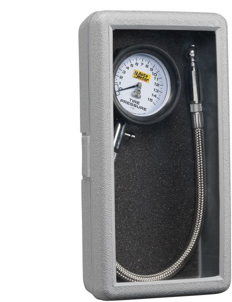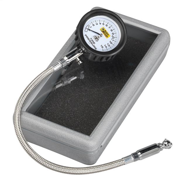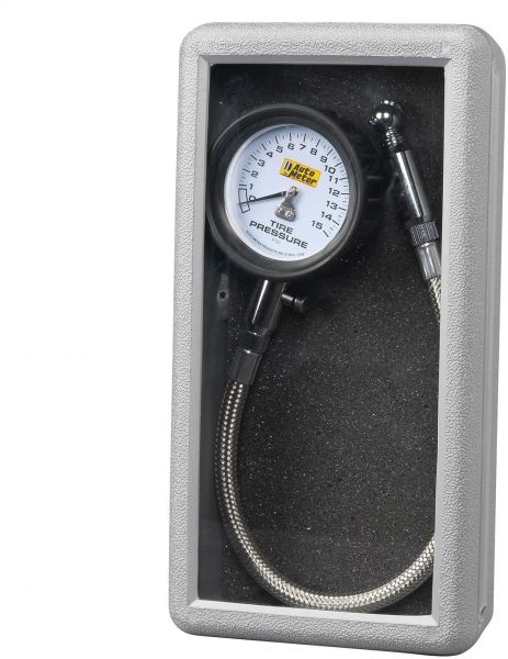 15 PSI Gauge w/Signature Racing Dial Design. Accuracy To 2.5 Percent FS. Large 2.25 in. Dial Face. Shock Dampening Easy-Grip Housing. 13.75 in. Stainless Braided Line. Incl. Protective Case.
