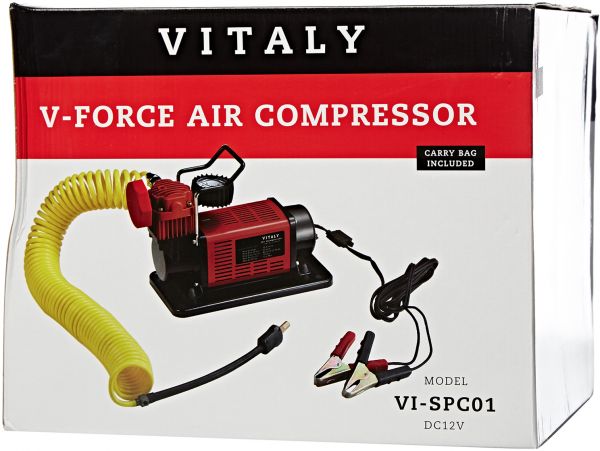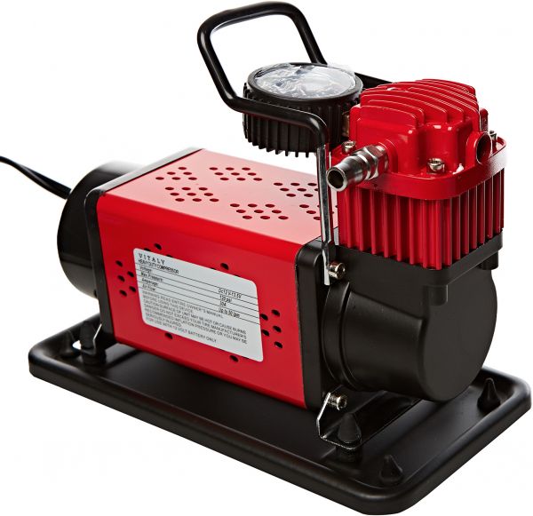 This portable air compressor from Vitaly has a small electric motor that compresses the air in a small attached cylinder tank. It can be plugged into a 12V car system for on-the-go repairs or inflation. It's ideal for car and bicycle tires, sports balls, airbeds and inflatable toys, etc. Because it can be powered through a cigarette lighter in your vehicle, it is incredibly versatile and a lifesaver in some dire circumstances.