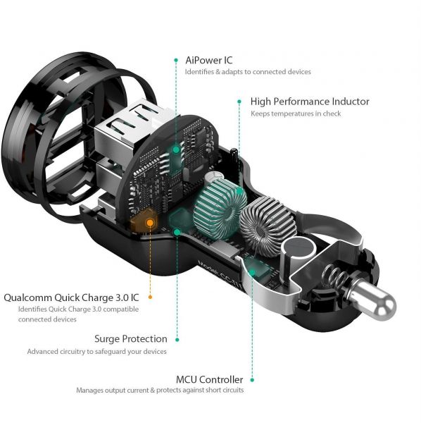 Aukey AiPower Adaptive Charging Technology, AiPower USB Port found on AUKEY CC-T11 car charger is engineered to provide the safest maximum recharge rate with up to 2.4A for all your different devices whether Android, iOS, Bluetooth headphones, cameras, or even other power banks.