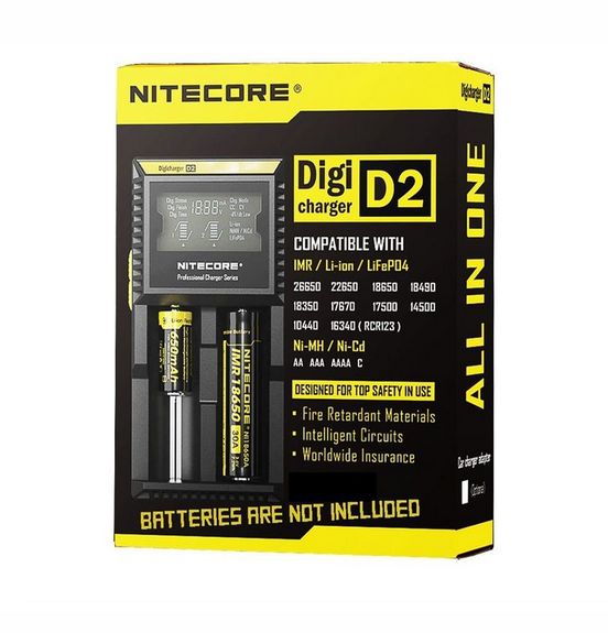 The Nitecore D2 is a universal smart charger compatible with almost all cylindrical rechargeable batteries, thus eliminating the need to own several chargers. The D2 automatically detects Li-ion, Ni-MH and Ni-Cd batteries, and through manual selection is also capable of charging LiFePO4 batteries. Intelligent charging circuitry selects the optimal charging mode (CC, CV and dV/dt) for a given battery and each of the D2's two microcomputer-controlled charging slots then monitors and charges the battery independently. Furthermore, an integrated digital LCD screen clearly displays charging progress, voltage, current and time while an intelligent automatic power-off function terminates current when charging is complete. The Nitecore D2: The world's most advanced fully-automatic digital charger. It's as simple as insert, detect and charge.