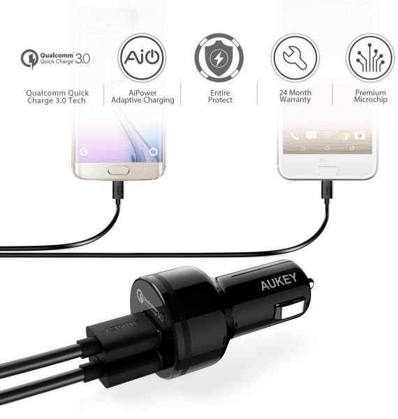 AUKEY Car Charger with Dual Quick Charge 3.0 Ports and Micro-USB Cable for LG G5, Samsung Galaxy S7/S6/Edge, Nexus 6P/5X, iPhone and More