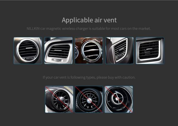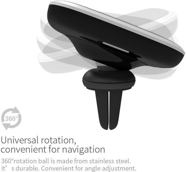 - Flexible silicone clip for stable installation no matter the thickness of air vent; built-in 360°rotating stainless steel ball for angle adjustment; blue indicator lights on the two sides to show the charging status.