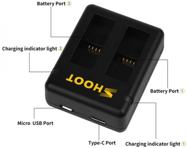 . SHOOT Double Channel charger can be powered by wall charger adapter, power bank, or your PC, Laptop, etc.