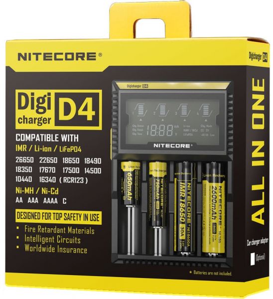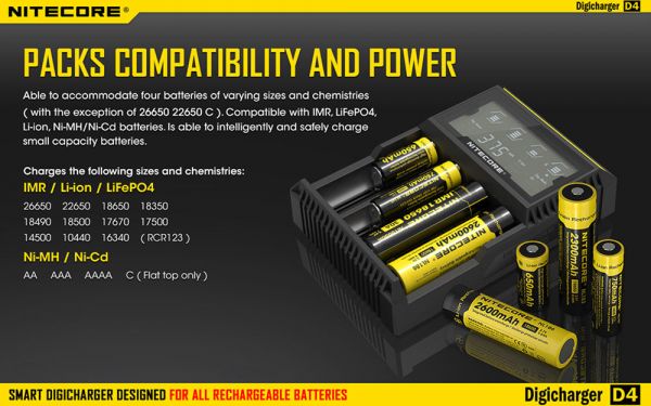 16340(RCR123), 14500, 10440), Ni-MH and Ni-Cd (AA, AAA, AAAA, C) rechargeable