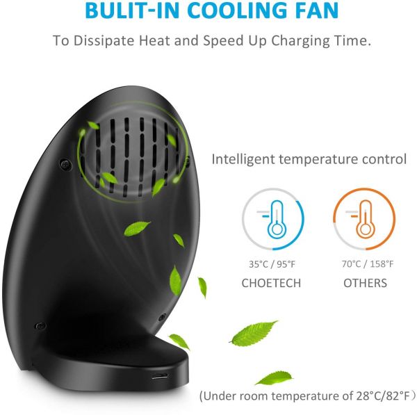 The back of the wireless charger is equipped with a 0.7 watt power noise-free cooling fan which will continue to cool the device in the charging process and reduce the risk of heating of mobile phone.(The fan can only spin when it is in fast wireless charging mode)