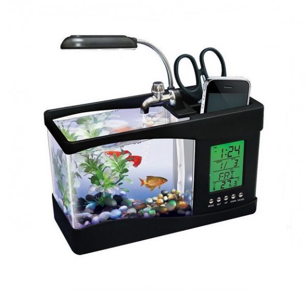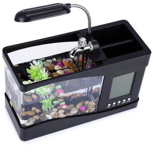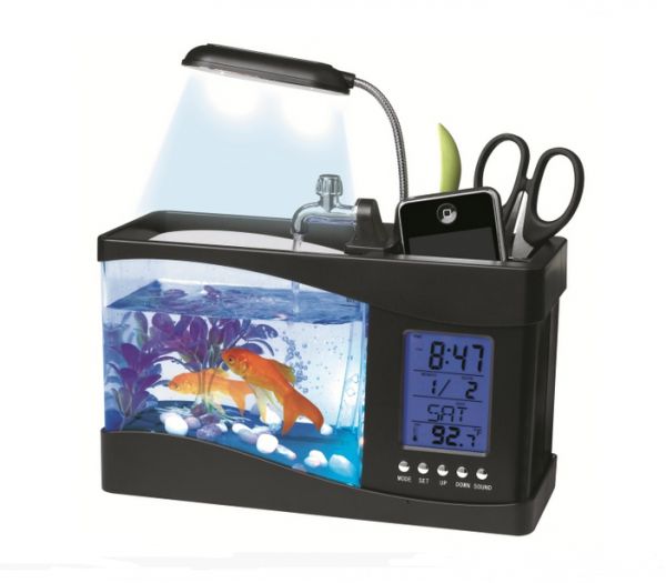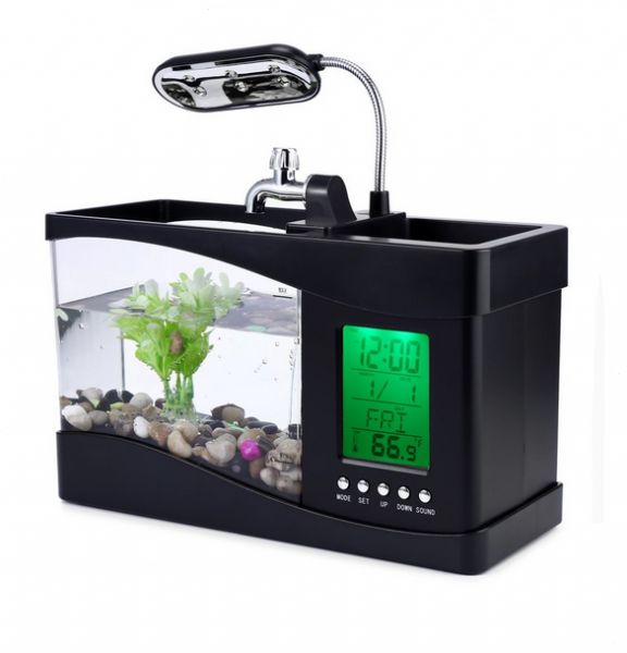 Product Description:-The water stored in the fish tank can be running circularly that fresh air can be provided for the fishes living in the fish tank-Hold about 1.3L of water-Batteries: 3 x AA batteries (not included) for LCD-Power: DC 5V for the fish tank's pump and lighting-LED light: 6 white LEDs and 2 colour-changing LEDs-LCD display: Clock, calendar, alarm, temperature-Sounds: sounds of frogs, sounds of bird, sunds of water-Backlighting LCD display is featured with alarm clock, calendar, time, date, temperature, and snooze-Dual compartment desk organizer or pen holder for setting pens, rulers, etc-Type: Decoration,Entertainment,Leisure -For: All -Material: Acrylic -Occasion: Bedroom,Home,Office Package Contents:1 x Fish Tank 1 x USB Cable1 x Packet of Handstone1 x Water Plant