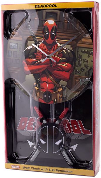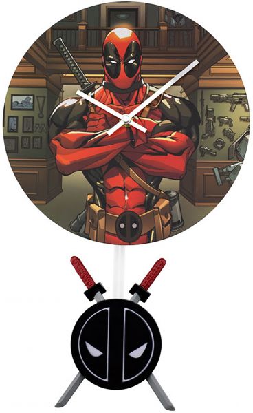 10" wall clock featuring Deadpool, aka Merc with a Mouth. This Art print quality clock face with 3D sculpted logo pendulum swings back and forth. Keep time in style with this battery operated pendulum wall clock!.