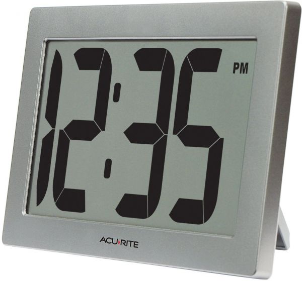 The AcuRite Digital Clock with Intelli-Time Technology is a large clock with bold numbers that are easy-to-read from anywhere in the room. Featuring a bright, 9.5-inch LCD screen, the digital clock is the perfect office clock, classroom clock or clock for home use in garages, rec rooms and more. Our Intelli-Time technology adds unprecedented convenience because it's pre-programmed with the correct time and date and automatically updates itself for Daylight Saving Time. This LCD digital wall clock has integrated keyholes for easy wall-mounting or sits upright for desktop use with its fold-out stand. One-year limited warranty. It's more than accurate, it's AcuRite. Large Digital Clock Large LCD screen Oversized 3.75-inch tall digits allow for easy-viewing from across the office, classroom, or living room Intelli-Time technology is pre-programmed with the time and automatically updates the clock for Daylight Saving Time Remembers time in event of power outage Keyholes for wall-mounting and fold-out stand for desktop placement.