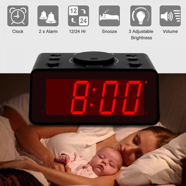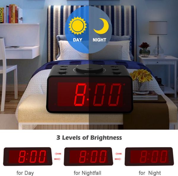Inside there are 3 levels of brightness settings you can choose from and the clock will also enter Night-mode and dim automatically at 8:00pm to 6:00am, to ensure you're not distributed while trying to achieve a full night's rest.