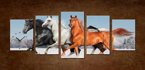 5 Pieces Set Running Horse Wall Clock Picture Clock Wall Art Canvas Print
