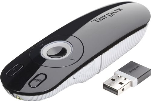 描述:The Targus Laser Presentation Remote features a clear and intuitive button layout,making it easy to give presentations. Thanks to its 2.4GHz cordless technology, you’ll be free to move around and control your Microsoft PowerPoint™ or Apple Keynote™presentation remotely, without wires and cords getting in the way. The patent-pending KeyLock™Technology locks non-essential buttons when not needed to help eliminate accidental button presses. The integrated laser pointer allows the presenter to highlight important content while the backlit buttons provide visibility in environments with low lighting. The latest RF 2.4GHz cordless technology works fromup to 15metres away, providing flexibility while presenting in large conference rooms or classrooms. The mini USB receiver stores neatly inside the remote when it’s not in use for added convenience, so it won’t get lost or damaged. Both stylish and functional, the Targus Presentation Remote is your essential tool in achieving seamless presentation results.