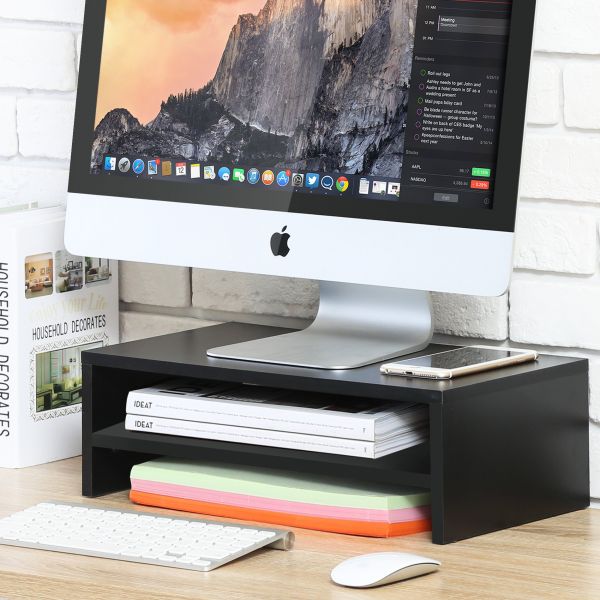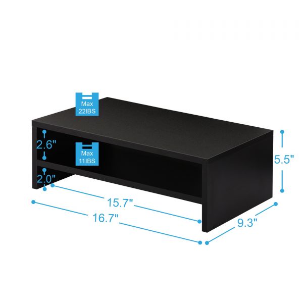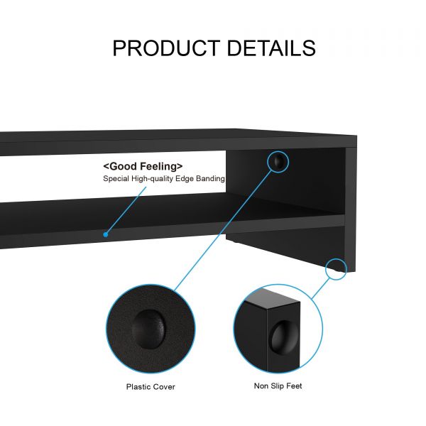 描述:Brand: FITUEYESFits laptop,PC,IMAC,LED LCD TV,scanners,printers,fax machines, keyboards etc Dimension: W 42.5 x D 23.5 x H 14cm Material: 12mm black matte MDF panelLoad capacity:15/5kgsHealthy: Raise your screen for comfortable height to reduce back and neck strainOrganizer: Store keyboard,smart phone,sticky notes or personal stuffs Feature: Double storage. Neatly accommodating makes your workplace instantly spacious. Commonly used stationery hand side, mobile phone pencil, tape, notes paper pass there is place to put, do not have to find everywhere, more convenient to use