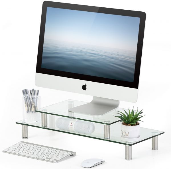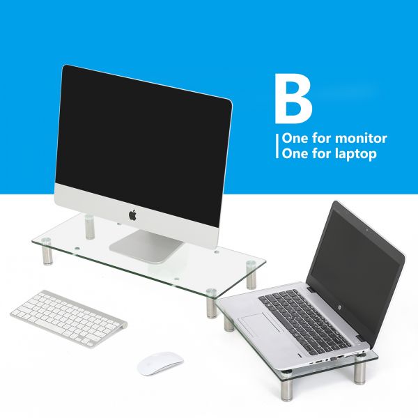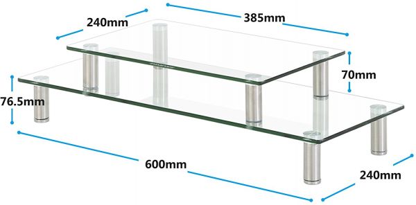 This item is multi-function, it can be used to raise your monitor, also can be used as a tv stand. 2 Layer shelves, One for monitor, the other for laptop 6mm tempered glass with metal leg, Weight capacity for shelf : 25kgs. The leg can adjustable height 0-12mm High stability. With 4 Anti-slip silicone pads, ensure high stability of your valued monitor. Small size, portable and easy to install within few minutes Slim, modern design made to look great on any desk or table