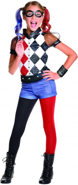 She'll be ready to make trouble in this DC Superhero Girls Deluxe Harley Quinn Costume. - Top - Shorts with Attached Leggings - Belt - Wrist Band - Eye Mask - Hair Pieces
