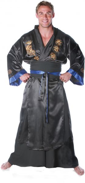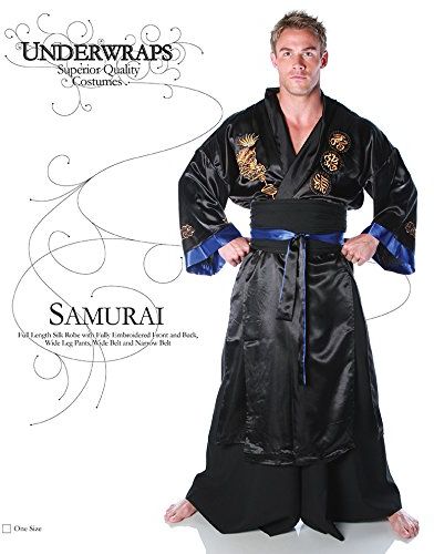 Our mens samurai Halloween costume includes a long embroidered silk robe, wide leg black pants and belt. Our samurai Halloween costume comes in adult sizes XX-Large, One Size. This Japanese samurai Halloween costume features golden embroidered dragons and Japanese script characters. Couples Halloween costumes ideas: The samurai costume goes great with a kimono costume or geisha costume for her. Samurai sword is not included with this adult Japanese warrior Samurai Halloween costume for men.
