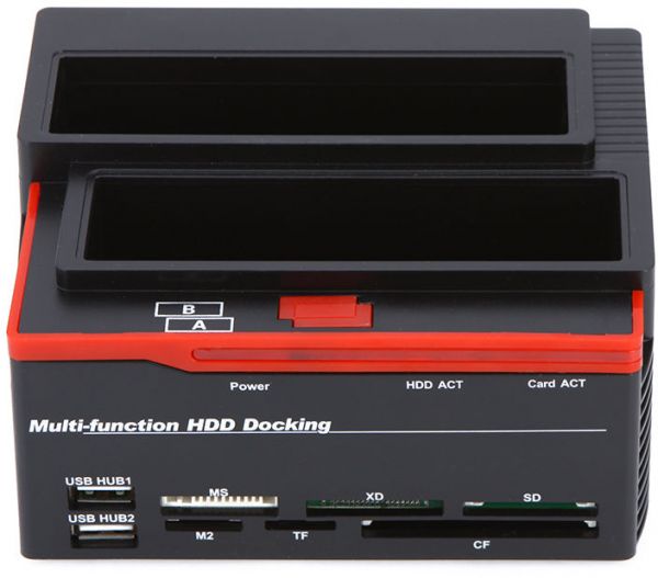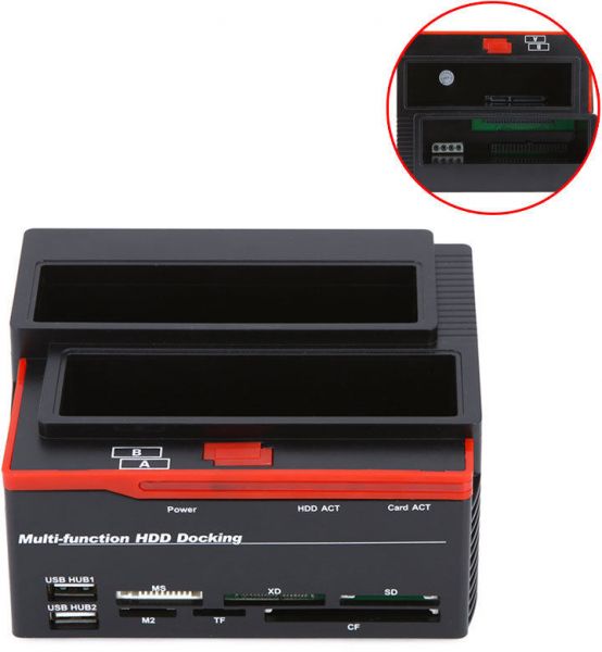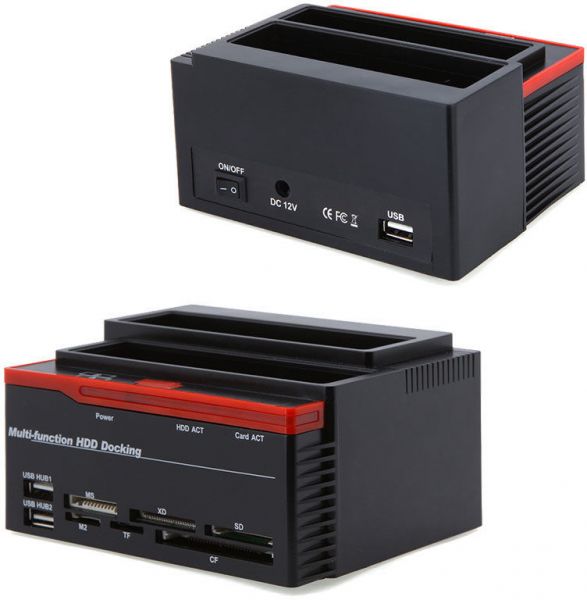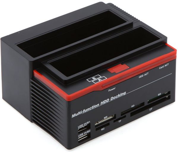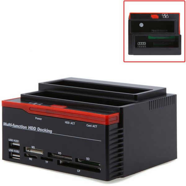 ALL-IN-ONE ITEM: HDD DOCK CAN ACCOMMODATE/STORE/EXCHANGE/BACKUP 1X 2.5"/3.5" SATA AND 1X IDE HARD DRIVES; USB 2.0 INTERFACE ENABLES DATA TRANSFER RATES UP TO 480 MBPS; MS/M2/XD/CF/SD/TF CARD READER; 2 PORTS USB 2.0 HUB.