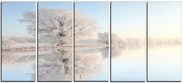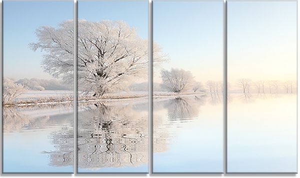 Designart 4 Panel "Frosty Winter Tree by Rising Photo" Canvas Art Print 48x28" - 4 Equal Panels Blue