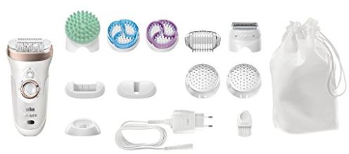 Braun Silk-epil 9 SkinSpa is our best 5-in-1 epilation, exfoliation and skin care system, featuring 12 extras. In addition to Braun's best Wet & Dry epilator, the set comes with a deep massage pad to improve skin tone, two exfoliation brushes for gentle and deep body exfoliation, and a shaver head and trimmer cap.
