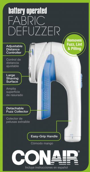 PlasticSafely removes fuzz, lint & pilling3-setting distance control for customized fabric "shave"Detachable lint catcher and comfortable grip handleLarge shaving headRequires two AA batteries required (not included)The Conair Battery Operated Fabric Defuzzer is a household must have to keep your garments looking and feeling like new. This fabric defuzzer quickly and evenly shaves unwanted fuzz, lint, and pilling. It is easy-to-use and adjusts to accommodate different fabric types. The large shaving head and easy-grip handle makes shaving quick and comfortable. It is the perfect garment care tool to keep on-hand.