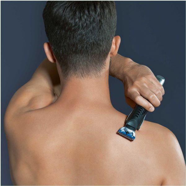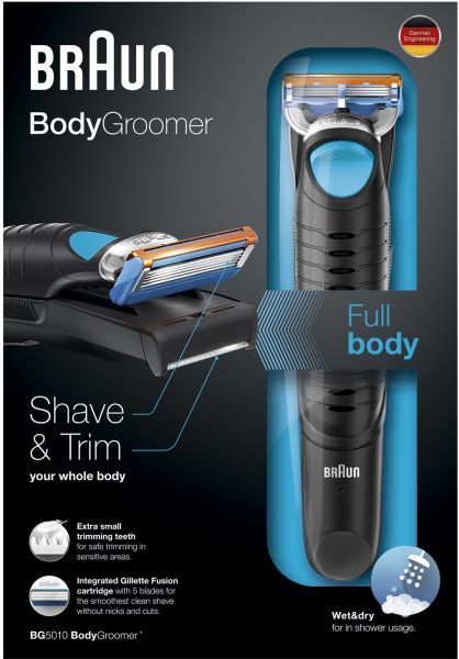 Braun Body Groomer BG5010 - Worry-free trimming for your whole body. This body hair trimmer is the perfect tool to maintain all areas of your body: from the chest and abs, to your armpits and groin. 100% waterproof, it allows you to manscape in the shower to complement your existing routine. As a 2-in-1 device you can trim and clean-shave your body hair in one movement, making your grooming routine fast and hassle-free. Braun Body Groomer comes with a fine trimming element that features smaller teeth than regular beard trimmers. This works to minimise any nicks and cuts for worry-free trimming on delicate areas like the armpit or groin. The three trimming combs allow you to choose the exact length of your body hair (0.6mm, 3mm, 8mm). Equipped with Gillette’s advanced shaving technology, Braun Body Groomer gives you a close and smooth shave. The 5 special blades are spaced close together to reduce pressure and offer maximum shaving comfort with minimal skin irritation. Wet shaving allows you to shave larger areas swiftly and in only one stroke for convenience. For a perfectly groomed look for your whole body.