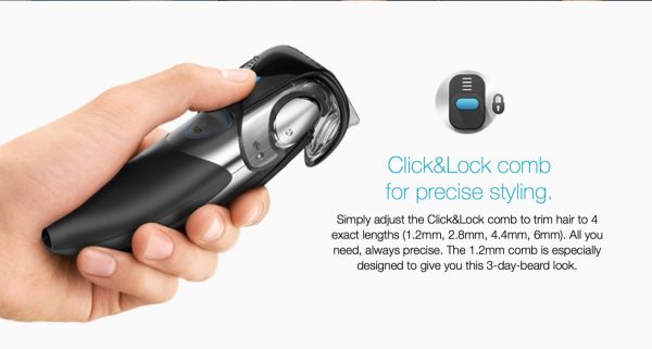 - Click&Lock comb for precise styling : Simply adjust the Click&Lock comb to trim hair to 4 exact lengths (1.2mm, 2.8mm, 4.4mm, 6mm). All you need, always precise. The 1.2mm comb is especially designed to give you this 3-day-beard look.