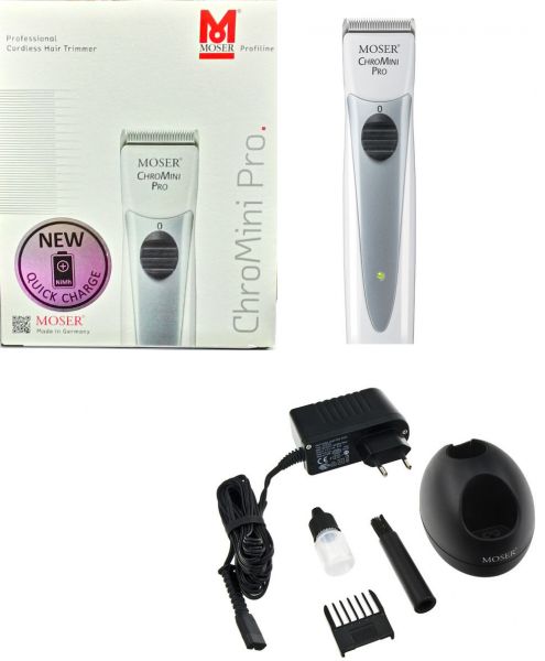 The Chiromini Pro White from Moser is a professional hair clipper of a cordless variety. Fitted with 32mm stainless steel blades of the Star Blade quality, it can cut up to 0.4mm of hair at one go. The device is powered by a soundless DC motor.Product Features:Blade set : Interchangeable stainless steel blade set STAR BLADECutting length: 0.4 mmType of Operation: RechargeableDrive: DC motor with sound proofing, approx. 5350 rmpBattery : NiMhDimensions(Depth, Width, Height): 142 x 32 x 32 mmWeight: 130 g
