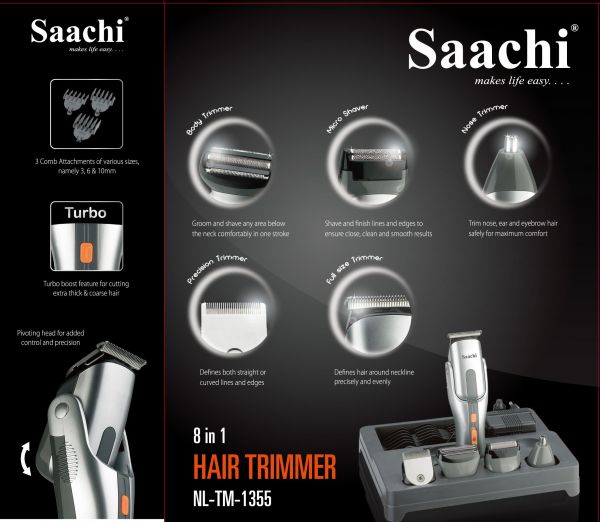 描述:Saachi 8 in 1 Hair Care Set includes Body trimmer that groom and shave any area below the neck comfortably in one stroke. Micro shaver to shave and finish lines and edges to ensure close, clean and smooth results. Ear and nose trimmer to trim nose, ear and eyebrow hair. safely for maximum comfort. Precision trimmer defines both straight or curved lines and edges. Full size trimmer defines hair around neckline precisely and evenly.