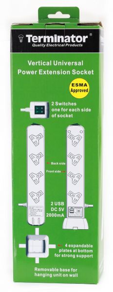 Terminator 8G Universal vertical power Extension socket with 2 USB Sockets two switches, 1.25mm2 cable and 13A fused plug, 3M wire. ESMA Approved