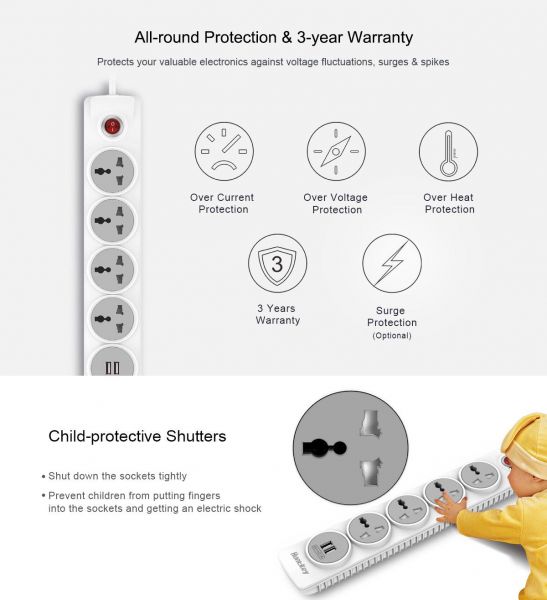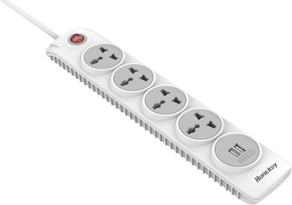 The Huntkey SZN 507 power extension will make an exceptional choice for both office and home use. It is crafted using exceptional materials and has a compact and lightweight design that allows for seamless portability from one place to another. This innovative power extension board features four international sockets and two USB ports that enable you to power up six different devices simultaneously. The power cord is made of the highest quality of material that imparts durability to it and makes it energy-efficient. It features a 750-degree retardant material that offers high-class protection from excessive heat and temperature. The child shutter functionality ensures the safety of children while the integral copper bar reduces heat buildup and saves energy. All the more, this high-performing Huntkey power extension comes with two keyhole slots at the back for convenient wall mounting. The plug-friendly sockets make the whole user-experience, fun and enjoyable.