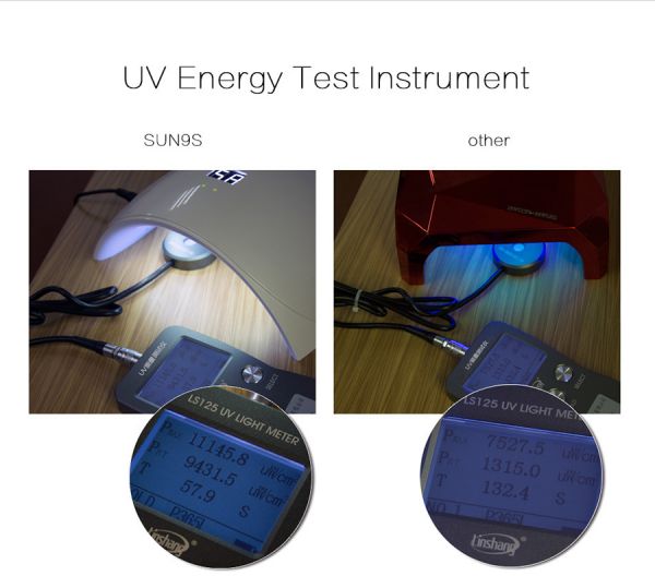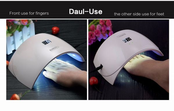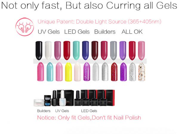 Latest technology of double light source covers a wider range of ultraviolet band, suitable for drying nail UV-glue, builder gule, nail polish gel, sculpture gel, gem glue and LED nail gel.