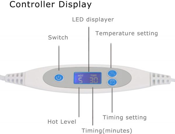 · It's designed to have 5 classes heat temperature from 37 to 52 °C and 6 classes timing from 10 to 60 minutes. It will stop working automatically when you go into deep sleep.