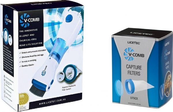 V-Comb uses its rounded, stainless steel-toothed comb and suction power to smoothly run across the scalp and gently lift lice and eggs. The V-Comb traps head lice and eggs removed from the hair and into its patented Capture Filter. After treatment, simply detach the Capture Filter and snap on the lid for hygienic disposal.
