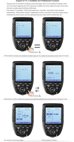 Fully support TTL autoflash, 1/8000s high-speed sync, multi flash, manual flash, flash exposure compensation, TCM transform function, magnification function, one shoot and multi-shoot setting, group modeling lamp control, group zooming, adjusting all groups' output value simultaneously, etc.