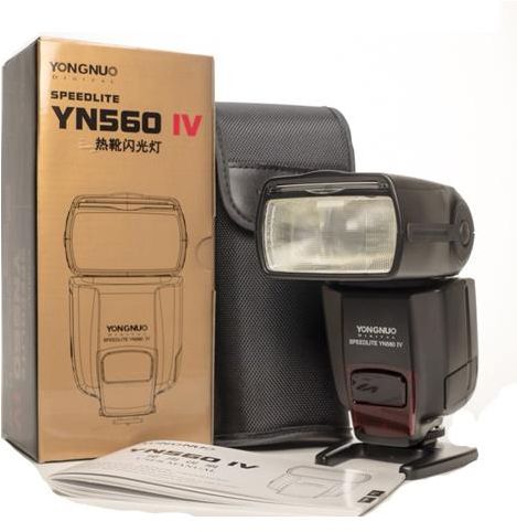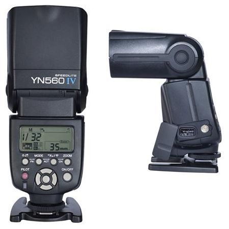 Product Highlights 2.4 GHz Transceiver with 328' Range Guide Number: 190' at ISO 100 and 105mm Zoom Range: 24-105mm (18mm with Panel) Output Range: 1/1 to 1/128 Tilts -7 to 90° & Rotates 270° Optical Slave Functionality Recycle Time: 3 Seconds Multi Mode for Firing Series of Flashes PC Sync Port Runs on 4 AA Batteries Mount Shoe Guide No. 190.29' (58 m) ISO100 at 105 mm position Exposure Control Manual Vari-Power Manual: 1/1 - 1/128 Bounce Head Yes, -7° to +90° Swivel Head Yes, 270° Coverage 18 mm - 105 mm (Full frame) Zoom Head Full frame: 24 mm - 105 mm Off Camera Terminal PC Recycle Time Approximately 3 seconds Flash Duration 1/200 - 1/20000 sec Flash-ready Indicator Yes Slave Timing Modes Instant Sync Skip Preflash Wireless Operation Method: RF Distance: Up to 328.08' / 100 m Wireless Communication Channels 16 Channels Wireless Groups 3 Groups Power Source 4x AA Alkaline, Rechargeable NiMH Batteries Dimensions (WxHxD) 2.4 x 7.5 x 3.1" / 60.0 x 190.0 x 78.0 mm Batteries Powercell AW8300/2300mah with Charger Featuring both a 2.4 GHz wireless radio transmitter and receiver, the Yongnuo YN560-IV Speedlite is a long range manual flash unit capable of triggering other flashes from up to 328' away as well as being triggered with the RF-603 and RF-602 wireless transmitters. The YN560-IV is powerful with a guide number of 190' at ISO 100 and 105mm. The unit is also quite versatile with a zoom range of 24-105mm, which is able to be expanded to 18mm with the built-in wide-angle diffuser. Additionally, this output can be adjusted from 1/1 to 1/128 power in 1/3 and 1/2 EV steps. Full bounce and swivel lighting is possible due to -7 to 90° tilt and 270° of rotation with the locking flash head. The flash can also be triggered optically with either instant sync or skip pre-flash options for simpler off-camera firing. A built-in PC sync port further enhances the flash's connectivity and a Multi mode allows for stroboscopic lighting effects. The flash runs on 4 AA batteries and has a recycle time of about 3 seconds. It comes with a protective case and a stand. Features 3 groups and 16 channels for wireless operation Can receive a wireless signal from YN560-IV, YN560-TX, RF-603 (I/II), and RF-602 Metal hot shoe for standard on-camera triggering Large LCD screen for viewing settings and making adjustments Socket for SF-18C or SF-17C external power pack Audible flash ready indicators offer different sounds based on flash status 100-1500 flashes from one set of batteries Automatically saves your current settings Built-in bounce card Color temperature of 5600K Eight levels of flash output from 1/1 to 1/128 with 29 individual settings Optical triggering range of 66-82' indoors or 33-49' outdoors
