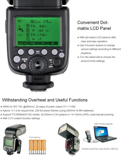 The TT685F are powered by traditional 4 x AA batteries, with the option of connecting an external High Voltage Battery Pack for faster recycle time