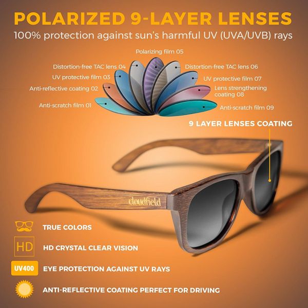 cloudfield Wood Sunglasses Polarized for Men and Women - Bamboo Wooden Wayfarer Style