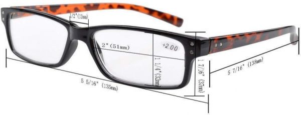 PRODUCTS DIMENSION-Frame material: plastic, Lens width: 2" (51mm), Frame width: 5 5/16" (135mm), Lens height: 1 1/4" (32mm), Frame height: 1 7/16" (37mm), Bridge (DBL): 1/2"(13mm), Temple length: 5 7/16" (138mm), Spring hinge: Yes, Lenses: Aspheric, Head size: Narrow to Medium.Rx-able frame