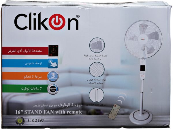 The Clikon CK2197 16" Stand Fan with Remote features a multi color LED display and a touch panel control pad for easy operation. Operate the Clikon CK2197 with ease using its remote control featuring a 3 modes which are normal, natural and sleep mode. Cool an entire room with the Clikon CK2197 16" Stand Fan with Remote as it provides users with 90 degree oscillation.