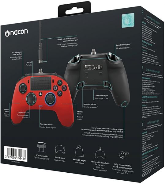 The Nacon PS4 controller features a customizable weight and ergonomic design. This Nacon controller boasts a striking red color scheme.Get an edge over the competition with the ergonomic and fully-customizable Nacon PS4 Revolution Pro Controller. The Nacon PS4 controller has dual analog triggers and dual shoulder buttons that offers excellent responsiveness. This gamepad features all the benefits of a PS4 controller including the innovative touchpad, SHARE button, as well as a 3.5mm headset jack. The bold red color scheme perfectly complements the controller’s ergonomic design. Four fully-programmable macro buttons are conveniently placed on this gaming accessory to give users quick and easy access to in-game abilities. The weight of this controller can be adjusted according to your convenience. A dedicated software helps you create custom profiles or upload profiles from the community.