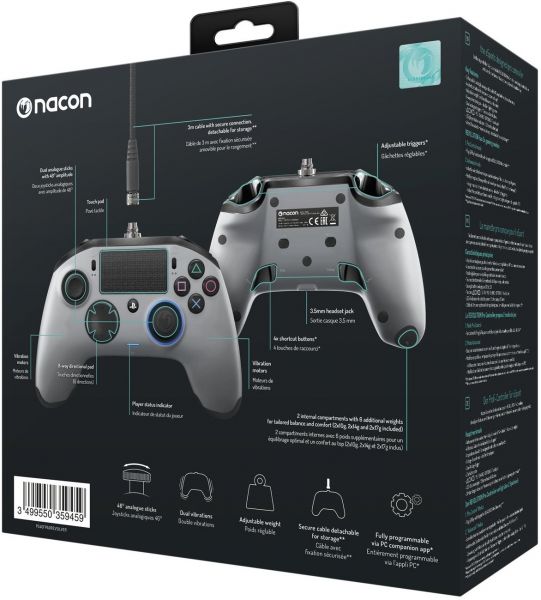 The Nacon Revolution Pro is an ergonomically designed PS4 controller. This Nacon controller is available in a smart silver finish.Take the fight to your opponent with the innovative Nacon PS4 Revolution Pro Controller. This Nacon PS4 controller is equipped with easily-accessible triggers, shortcuts and shoulder buttons to help you execute commands quicker. The dedicated patented app can be used to map shortcuts directly on to the buttons from your PC. The weight of the controller can also be adjusted to a player’s convenience by adding or removing weights from the compartments. This Nacon Revolution Pro PS4 gamepad features all the benefits of a PS4 controller including the innovative touchpad, SHARE button, as well as a 3.5mm headset jack.