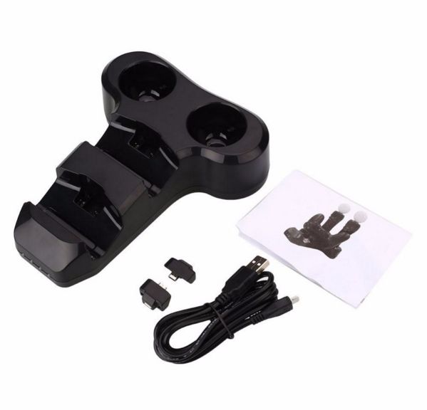 Specifications: Material: ABS Input voltage: DC 5V Color: Black 4. Compatible with: PS4 , PS MOVE Full charge to 2 controllers simultaneously within 5 hours. Compatible Controllers: PS MOVE Controller and PS4 Controller What you get:1x PS4 Charging Dock 1x Charging Cable 2x Dongles 1x Manual