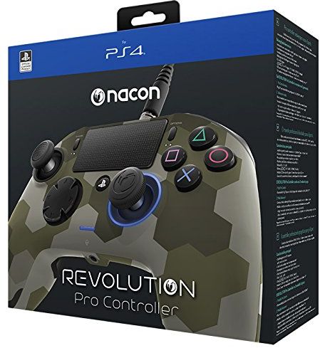 Nacon Revolution Pro is a fully customizable controller. This Nacon PS4 controller maximizes your gaming potential.The Nacon PS4 Revolution Pro Controller for PlayStation 4 is the perfect weapon to conquer the console gaming world. It has an 8-way directional pad that delivers excellent precision to elevate your game. This Nacon PS4 controller has dual analog triggers and dual shoulder buttons that offers excellent responsiveness. Furthermore, the dual analog sticks with 46 degrees amplitude deliver an incredibly high level of accuracy. This controller features a 3m detachable cable for a secure connection. Available in a camo green finish, this Nacon controller is developed and designed bearing in mind professional eSports requirements.