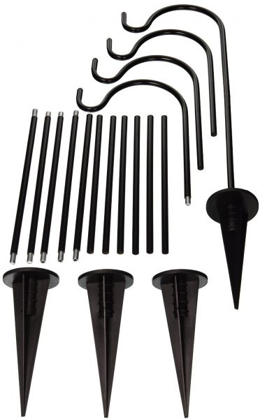 Set of 4 Sheppard Hooks wtih 4 Ground Stakes. Steel with black finish. Multi-use hooks for plants or yard ornaments. These hooks have adjustable height from 7 - 16 - 28 inches. Each hook holds a weight capacity of 5 lbs. With multiple sets you can decorate a driveway, pathway, deck or sidewalk. Use your imagination for party decorations. Steel stakes with powder coated finish in black. Comes as a set of 4 shepard hooks. Includes 4 ground stakes. Use for plants or yard ornaments. Adjustable height 7, 16, or 28 in.. Weight capcity: 5 lbs..
