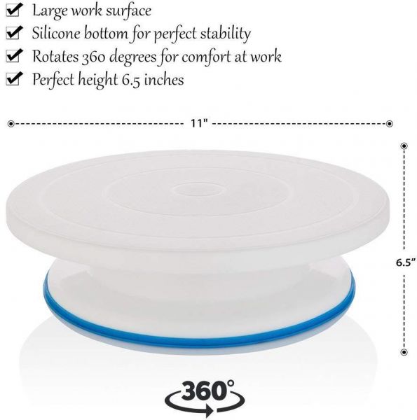 - Rotating Cake Turntable. With flexible axis, rotate smoothly in either clockwise or counterclockwise direction. It has an anti-slip base to fix the turntable.