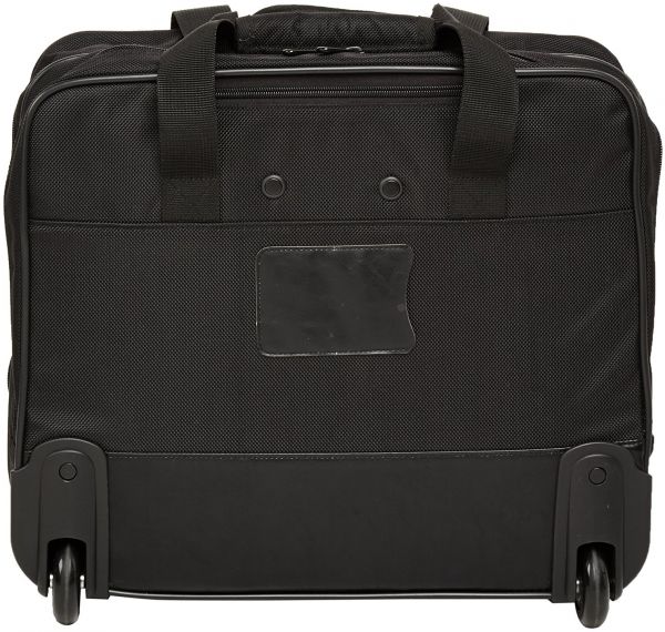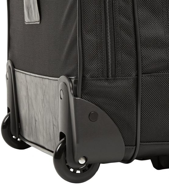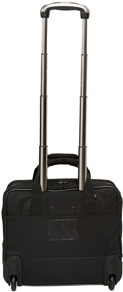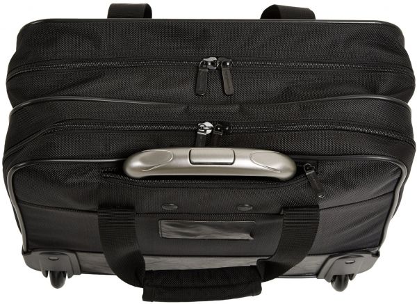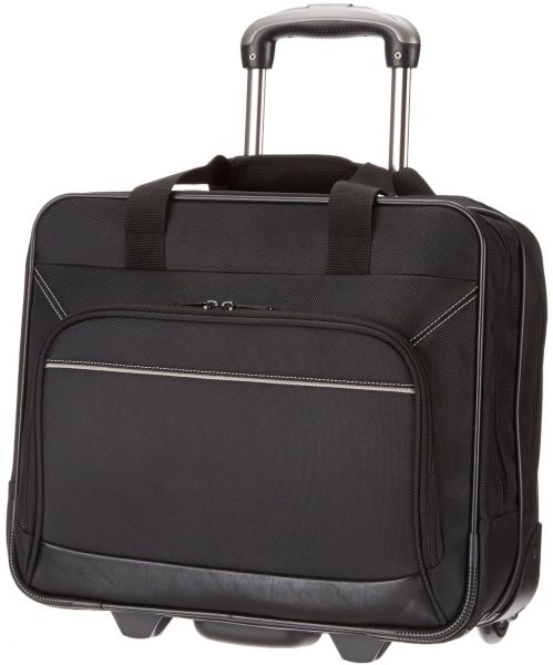 This AmazonBasics rolling case for laptop features an adjustable push-button locking upright handle and durable rolling wheels for excellent maneuverability from one location to another. The dual top handles allow for comfortable carrying while the telescoping handle can be retracted into a zippered compartment when not in use. The case comes forth as a carry-on travel luggage, fitting in the overhead compartment or under the seat.