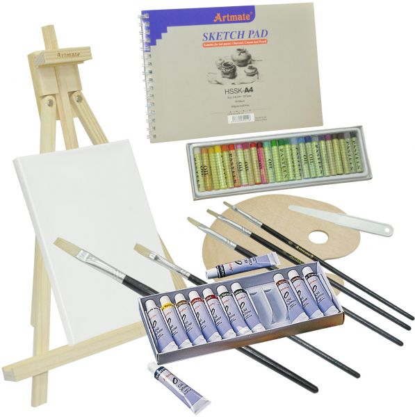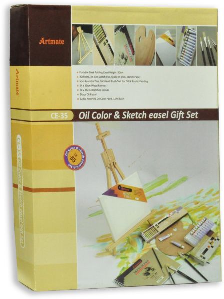 Portable Desk Folding Easel Height: 60cm, 30 Sheets, A4 size Sketch Pad, Made of 150G Sketch Paper, 5Pcs Assorted size Flat Head Brush Suit, For Oil and Acrylic Painting, 24x30cm Wood Palette, 24x30cm Stretched Canvas, 24Pcs Oil Pastal, 12Pcs Assorted Color Oil Paint, 12ml Each.